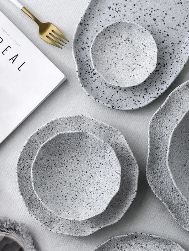 A modern take on a natural pattern, these ceramic plates are inspired by nature. With a granite pattern and organic design, these textured plates set a modern table with an approachable retro feel.