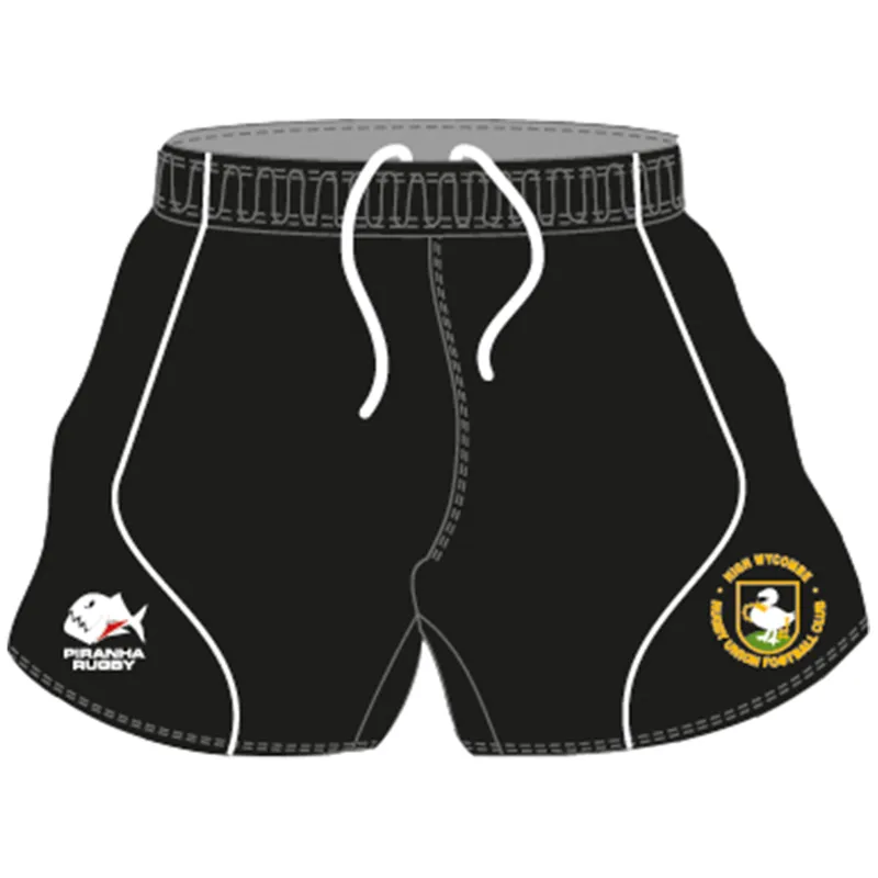 Black High Wycombe RFC Playing Shorts with white piping and drawstring waist. Embroidered club logo left leg and Piranha logo right leg