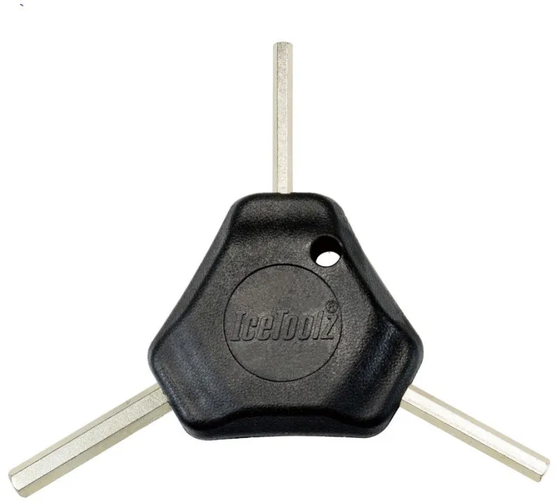 The IceToolz Y-key with 3 sizes of hex keys in sizes 4, 5 and 6 mm. The Allen key fits comfortably in your hand and you always have the correct Allen key size at hand. This Y-key is made of chrome-vanadium steel with a plastic grip.