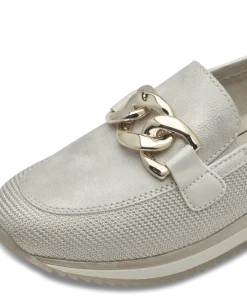 A versatile loafer that blends everyday comfort with subtle detailing. This Jana style features a soft textile upper with leather-look accents and a refined chain detail across the front for a polished finish. Designed with a wider fit, it offers extra room while maintaining a clean, contemporary look. An easy choice for smart-casual days when comfort matters.