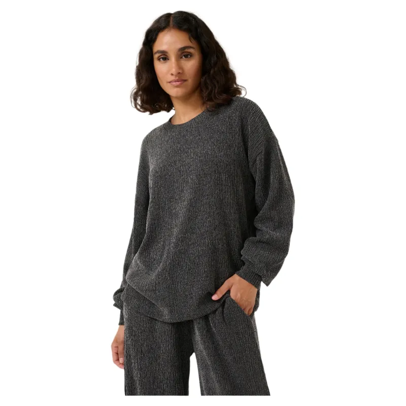 Get ready for those colder days with the ladies Olga Blouse from Kaffe just for you. The Olga Blouse is crafted in a lightweight fabric with long sleeves and a round neck. The Material comes in a dark grey melange colour with a stretch, making it super comfortable. Complete with wide ribbing to the cuffs to keep the warmth in.