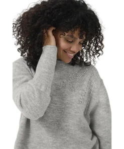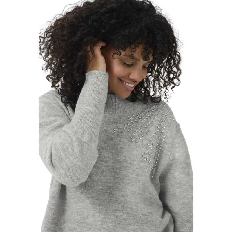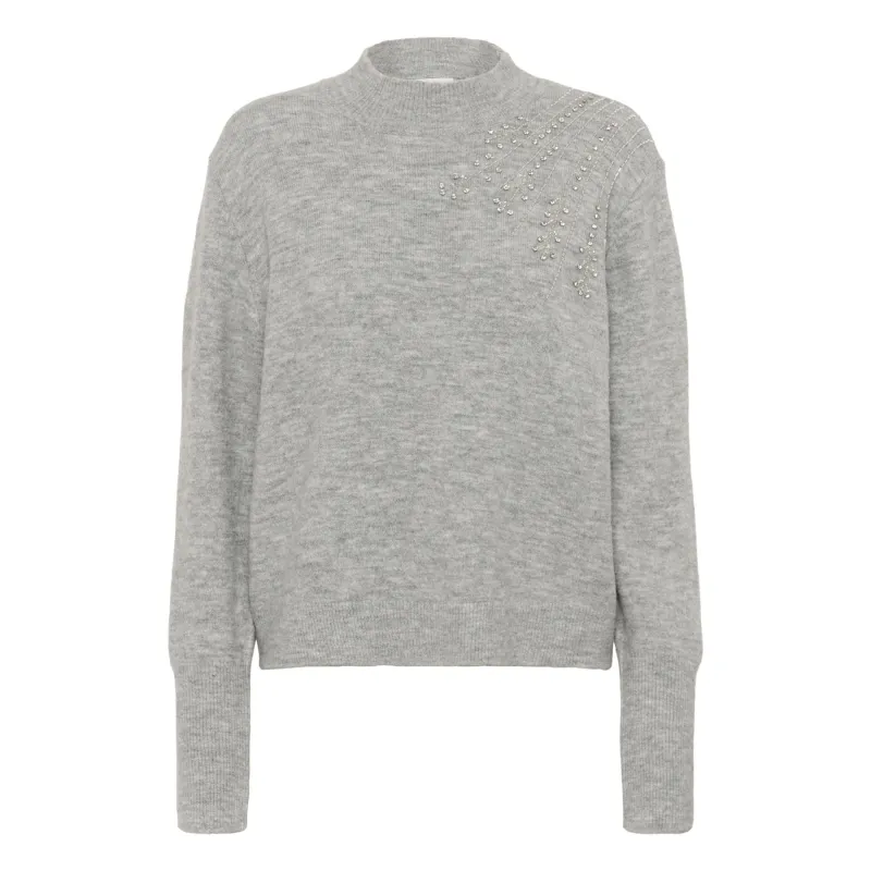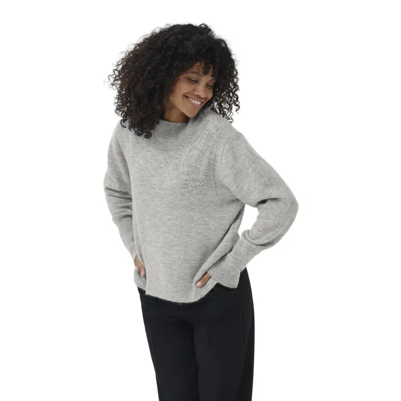 The Kaffe Stary Pullover brings a touch of sparkle to your everyday wardrobe. Crafted from a soft knit blend, it combines cosy comfort with a hint of elegance thanks to the delicate bead and gem embellishment across the shoulder. The high neckline and relaxed fit make it both flattering and easy to wear. Perfect for dressing up casual days or adding subtle shimmer to evening looks.