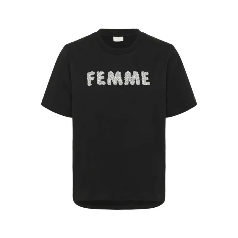 The Kaffe Arina T-Shirt brings a fun and confident edge to your everyday wardrobe. Crafted from soft cotton, it features bold gemstone lettering spelling FEMME across the chest for a playful touch of sparkle. Its relaxed fit makes it perfect for pairing with jeans, skirts or tailored trousers for an effortlessly cool look.