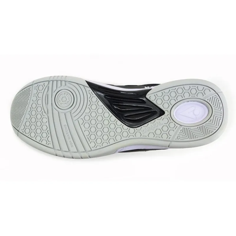 Karakal Prolite Classic Court Shoes offers exceptional lateral stability due to the heel and forefoot band and lace Loop system which stops the foot rolling on sideways movement. The exclusive Karakal non-marking outsole with its built-in turning circle is designed to make direction changes easier. The extra tacky Gum Rubber compound gives great adhesion when the foot is planted, deep grooves across the forefoot allow the toes to bend naturally and the TPU Anti – reverse bend insert provides stability and has the potential to reduce foot and lower limb injuries. The Phylon midsole density has been adjusted for maximum comfort and support, the under-heel shock absorber and EVA layer under the High-Density Performance Insole add to the shock absorption properties. The upper uses the highest quality Microfibre materials for the support areas and the mesh allows the foot to breathe. The tongue has also been lengthened and shaped to increase comfort.