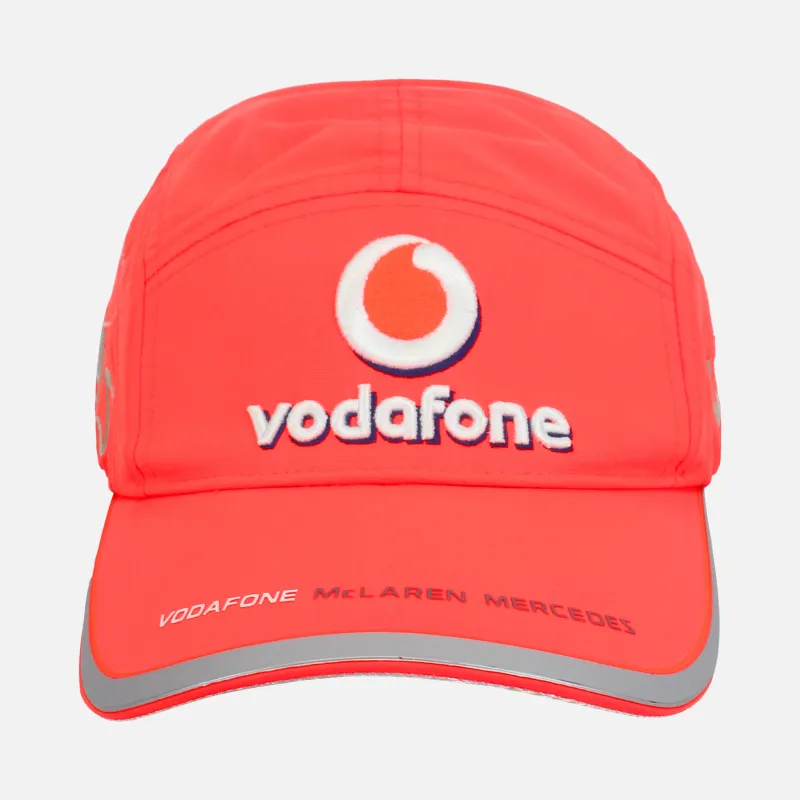 Lewis Hamilton 2010 cap, Vodafone McLaren Mercedes, F1 Team in Neon Orange. Curved peak style featuring the Vodafone logo and Lewis embroidery down both sides. This hat also includes the 2 detailing under the peak, celebrating Lewis’s World Championship in 2008 and Jenson Button’s in 2009. The 2 became team mates for the season, creating a Back 2 Back Championship winning duo. Brand new with tags, adjustable clasp.