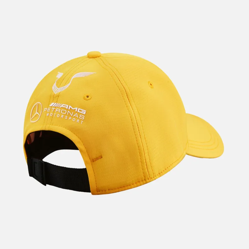 Lewis Hamilton 2020 Abu Dhabi grandprix cap, Mercedes AMG Petronas F1 Team in Saffron Yellow. Limited release for the final race of the 2020 season, in which Hamilton secured his record 7th Formula 1 World Championship. Curved peak style featuring the Mercedes logo embroidery, Gran Turismo side print and adjustable clasp.