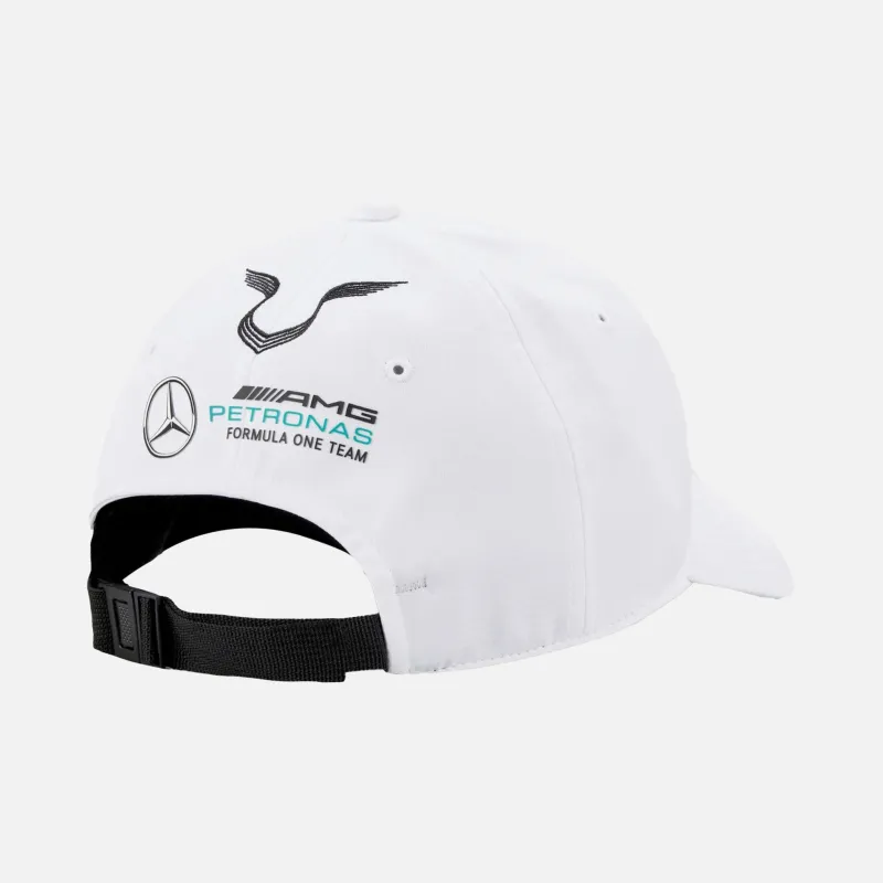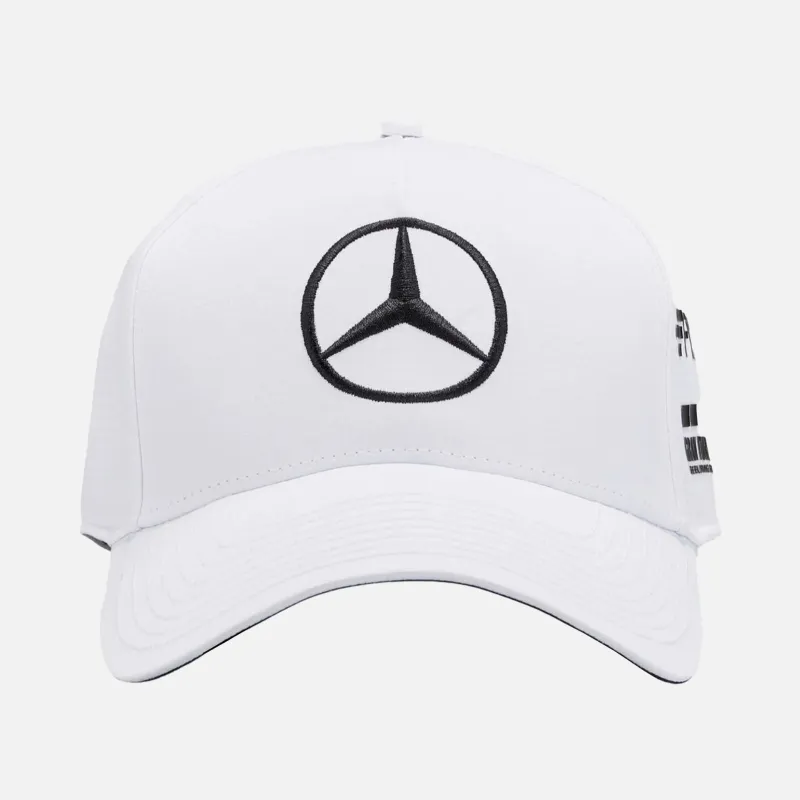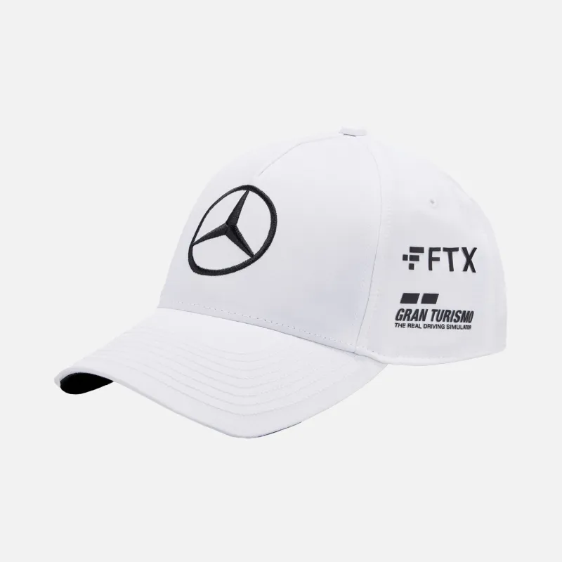Lewis Hamilton 2022 cap, Mercedes AMG Petronas F1 Team in White. Release for the 2022 F1 season. Curved peak style featuring the Mercedes logo embroidery, Gran Turismo side print and adjustable clasp.