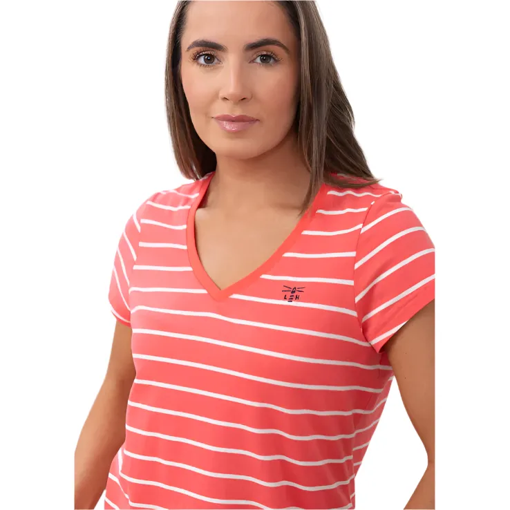 The Ariana Tee is a comfortable and stylish ladies V-Neck short sleeve T-Shirt from Lighthouse, perfect for casual styling. In coral with white stripes throughout. Finished with a Lighthouse logo embroidered onto the chest in black.