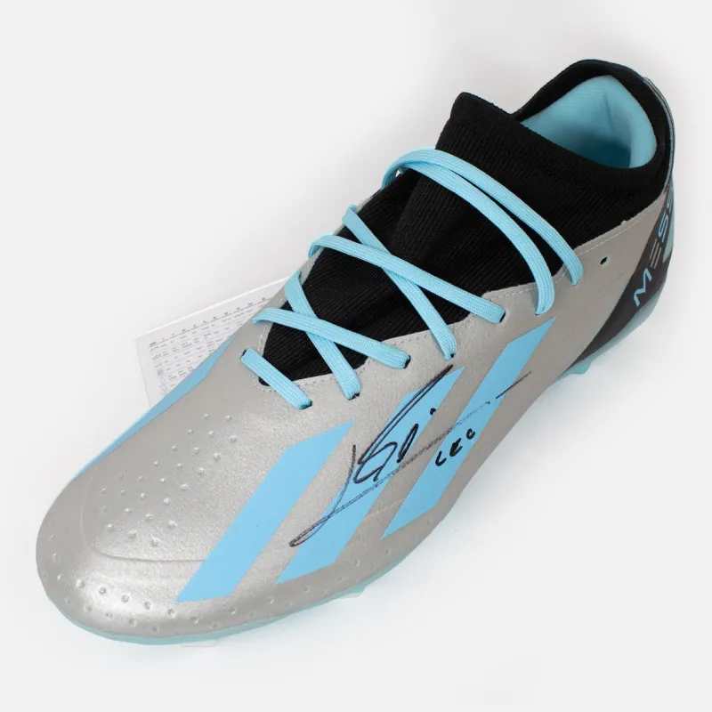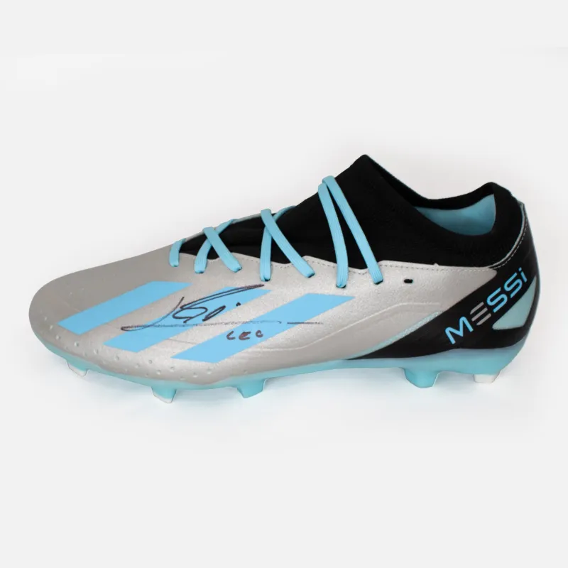 Lionel Messi personally signed Adidas X Crazyfast football boot in an Argentina-inspired colourway. Messi is a Ballon d’Or winning icon and a World Cup champion with Argentina, widely regarded as one of the greatest players the game has ever seen. The Adidas X Crazyfast is part of Adidas’ speed silo, built with a lightweight synthetic upper and a Firm Ground outsole for natural grass. Authentic autograph, with NFC technology, perfect for display.