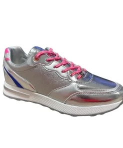 Turn heads with the ladies chrome sparkle fashion trainer from Lloyd & Pryce. The Barley is designed in a shimmering synthetic silver, featuring pink and blue tones. Fastened with pink laces and finished with a padded insole for extra comfort.