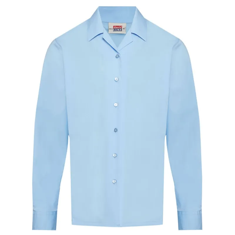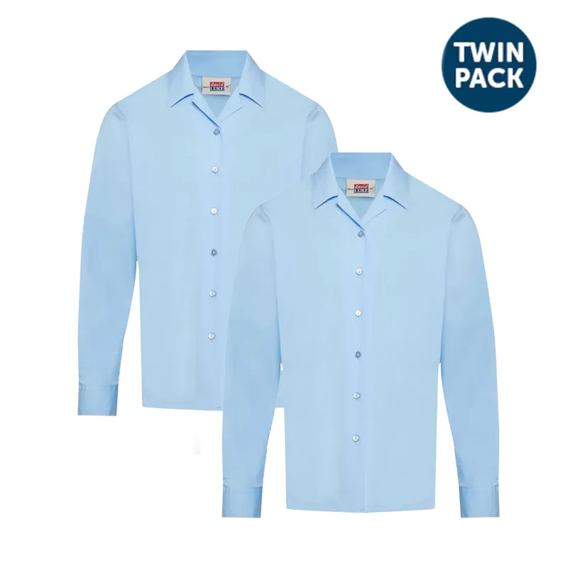 Twin pack Girls Rever long sleeved Blue School Shirt with easy care features, that can be washed, tumble dried and ready to wear.