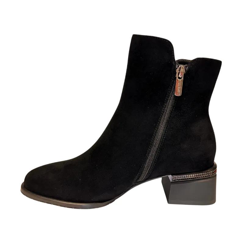 The Loretta Vitale C3844A in Black is an elegant ankle boot designed to add a touch of sparkle to your everyday and evening looks. Crafted in soft suede with a chic bow detail at the side, it’s elevated by jewel embellishments and a block heel finished with metallic trim. A timeless style with a glamorous edge, perfect for pairing with dresses or sleek trousers.