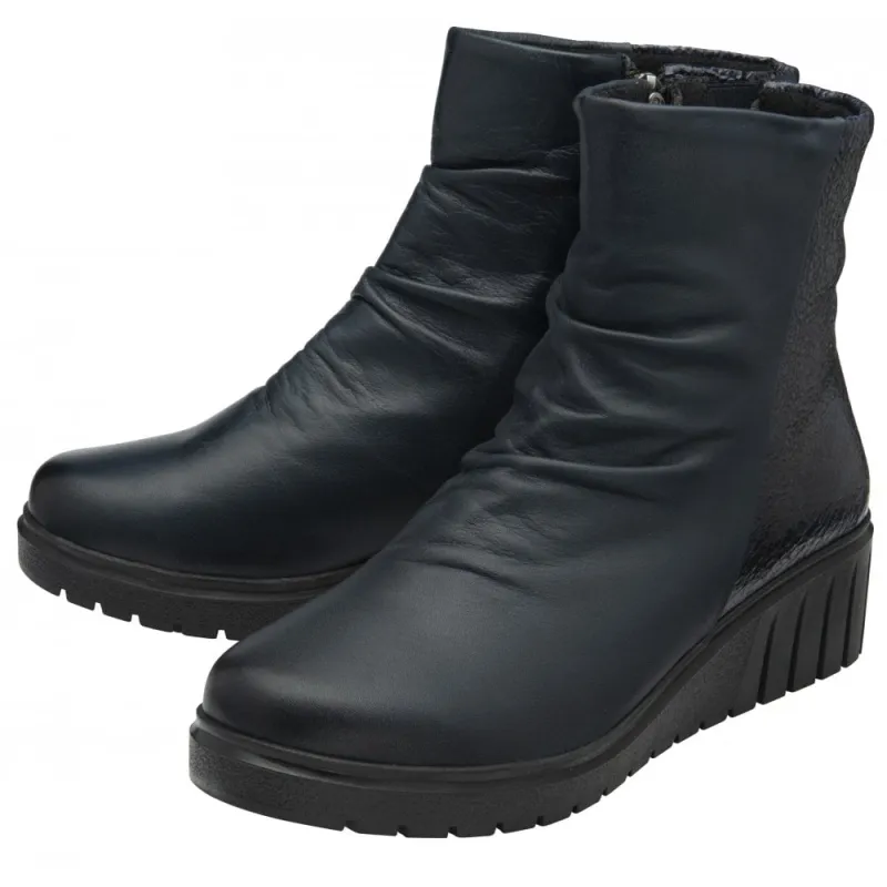 The Lotus Adlee ankle boot in navy is the perfect blend of style and substance. Crafted from premium leather with subtle ruched detailing, it offers a chic, slouchy profile that pairs effortlessly with denim or tights. The glossy patent-look heel panel adds a touch of edge, elevating the overall design.