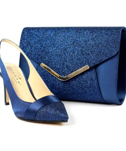 These womens slingback heels are perfect for your next occasion. Finished in a silk navy upper with glitter toe. These shoes sit on a 8cm heel. Matching bag available.