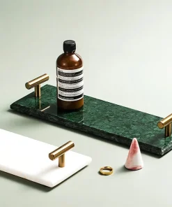 Stylish organization is a breeze with our marble bathroom organizer that fits beautifully in any room of your home. This gorgeous marble storage tray will complement any setting with its striking marble base and brass handles. We love this multipurpose organizer tray for the bathroom to hold cosmetics, nail polish, toothpaste or beauty products, and in the bedroom to hold jewelry, fragrance bottles, trinkets and other treasures. It also looks elegant in the kitchen to hold dishwashing liquid, hand soap and lotion. Keep your countertop, dresser and vanity neat and tidy while adding instant glamour to your home. Our Marble & Brass Bathroom Storage Tray Organizer makes a thoughtful gift for a housewarming, anniversary, engagement or birthday. Beautifully crafted of natural marble in your choice of green, black, gray or white, this stunning organizer makes a lovely accent on a bathroom vanity, desk top, bookcase, entrance table, dresser or night table, holding a candle or reed diffuser. The decorating possibilities are endless.