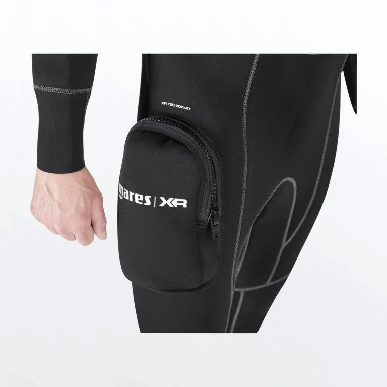 The XR line’s entry level neoprene drysuit, the XR3, includes latex neck and wrist seals, graphite protection on knees, shoulders and posterior and offers great flexibility.