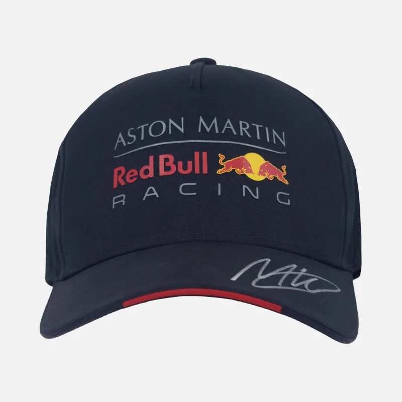 Max Verstappen personally signed Red Bull Racing F1 Team cap. Authentic autograph in silver on curved brim hat style featuring the Aston Martin Red Bull Racing print on front and adjustable snapback.