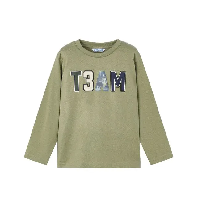 Add a sporty-cool vibe to your boy’s wardrobe with the Mayoral Boys Long Sleeve T-Shirt in Pistachio. Crafted from soft cotton, this comfortable tee features a bold “T3AM” graphic across the chest, mixing print and applique for a fun, textured look. Its versatile pistachio shade makes it easy to pair with jeans, joggers, or shorts for casual, everyday outfits.