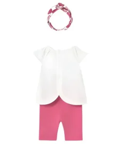A vibrant three piece set for your baby from Mayoral. This lovely set includes a t-shirt, leggings and a matching headband. The t-shirt features a bold fruit print in Pink with textured detailing. The leggings are crafted in a pink material and feature a small cut-out at the bottom of the leg. The look is completed with a headband featuring a fruit pattern in matching pink.