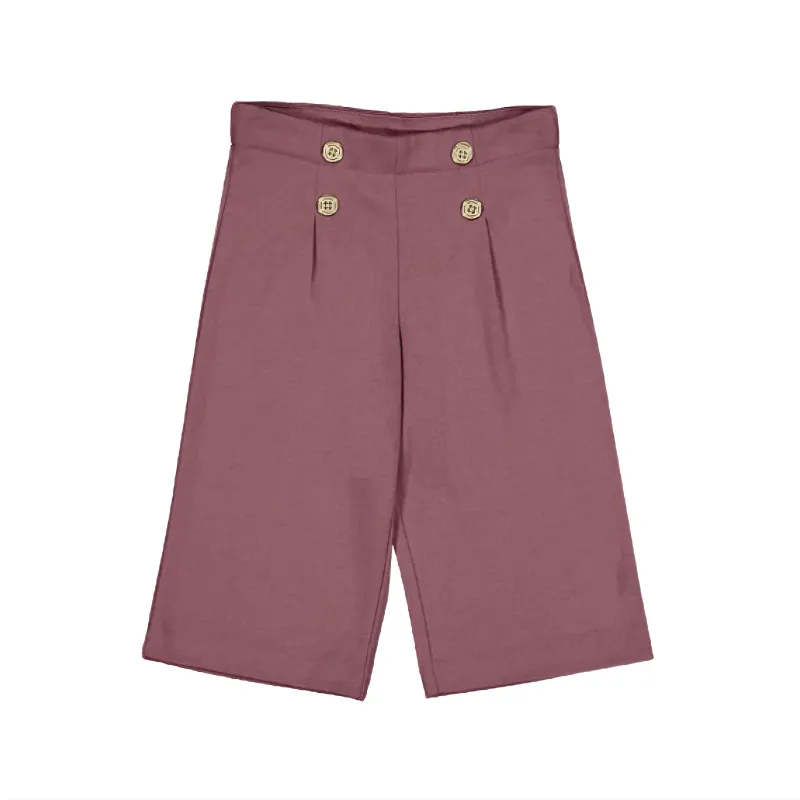 These Mayoral girls’ trousers in a chic rose tone are a stylish update to her wardrobe. Designed with a wide-leg culotte cut, they feature elegant front pleats and gold button detailing at the waist for a touch of sophistication. Perfect for both casual wear and dressing up.