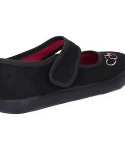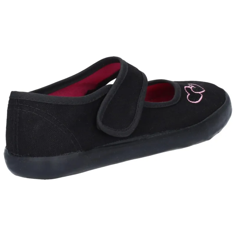 Girls classic Bar back to school plimsolls. Vintage designed canvas uppers with cheeky cute heart embroidery and contrast pink stitching accents. Features vulcanised rubber gym sole and adjustable touch fastening bar strap.