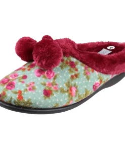 Ladies slip on mule slipper with colourful knitted upper and cosy microfiber fur lining. Fun pom poms make this a delightful style to wear around the home. Ideal gift for her.