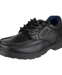 Junior boys semi-formal back to school shoe with quick four eyelet lace front and stylish mocassin toe. A gently padded mesh collar and lining keeps feet comfortable through the school day.