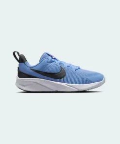 Ready, set, play! The Nike Star Runner 4 Next Nature offers lightweight comfort, energetic style, and eco-conscious design. Made with at least 20% recycled content, this sporty trainer features a breathable blue mesh upper, plush cushioning, and durable traction — perfect for school days, sports, and everything in between. Built for kids on the move.