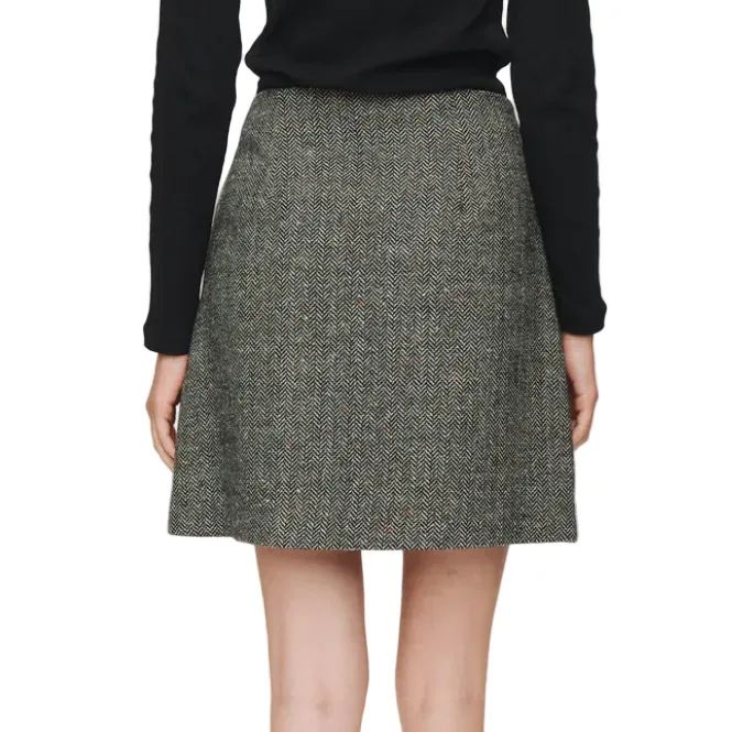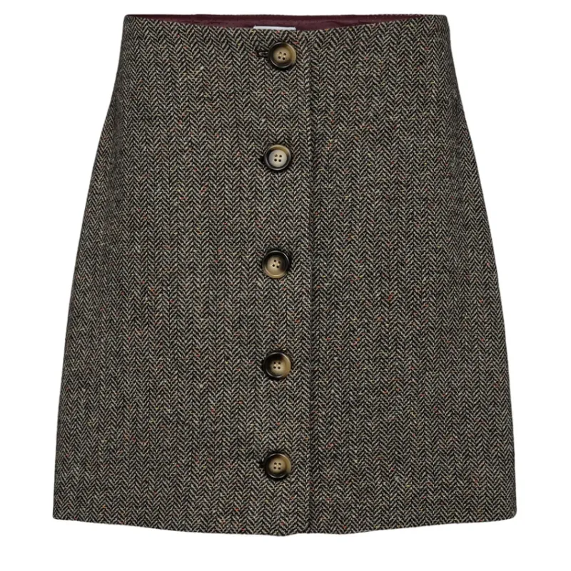 The Nümph Nuavey Mini Skirt in Caviar is a sophisticated wardrobe staple with a contemporary twist. Crafted in a soft herringbone tweed, this A-line skirt features a flattering button-front design that adds structure and charm. Perfect for pairing with tights and boots in cooler months or dressing up with a blouse for a polished look, it blends effortless style with everyday versatility.