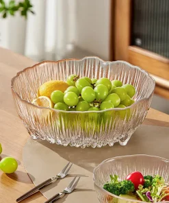 Crafted from durable clear glass, the bowl’s sculptural shape adds subtle dimension while maintaining a clean, modern aesthetic. The rippled surface enhances visual depth without distracting from the food it holds, making it ideal for showcasing colorful ingredients and seasonal spreads.