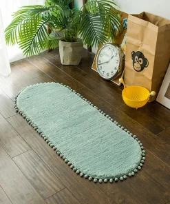 Grab your pom-poms — this playful oval rug gives you plenty to cheer about. Plush and luxurious, our pom-pom trimmed rug is super soft and comfy underfoot. It offers a fabulous landing spot when you step out of bed in the morning and is ultra-absorbent beside the bath. This playful rug is available in several pretty colors. Choose one for the nursery, ensuite, or guest bedroom.