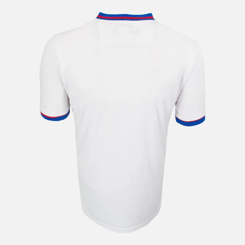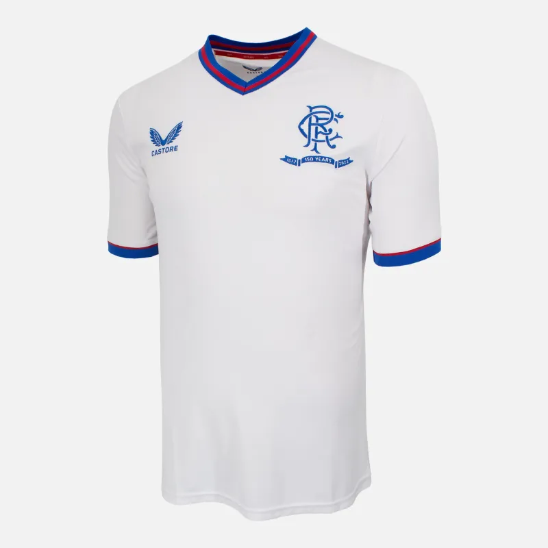 Rangers 150th year anniversary training football shirt. Clean all white v-neck design with the 150 year club crest, no sponsor.
