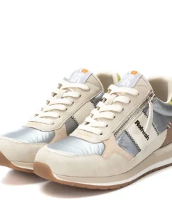 A sporty inspired womens trainer from Refresh perfect for your casual wardrobe. In a mix of neutral faux leather uppers with metallic silver panelling and pop of yellow snake print to the heel for added detail. Set upon a slight wedge heel for added height without compromising on comfort. Lace fastened with an outer zip for easy access. Textile lining