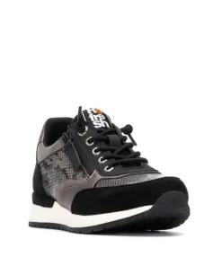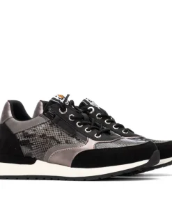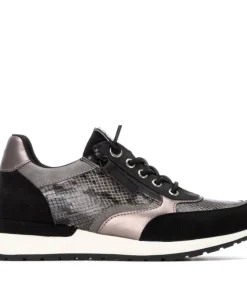 A stylish black trainer for her from Refresh. The 172960 trainer features a gentle wedge with a heel height of 35mm with a white midsole that contrasts beautifully against the black, pewter and metallic grey of the synthetic and textile upper. Touches of snake print to the sides and toe box draw the eye. The trainers fasten with elasticated bungee laces and a concealed zip for easy on and off.