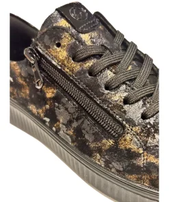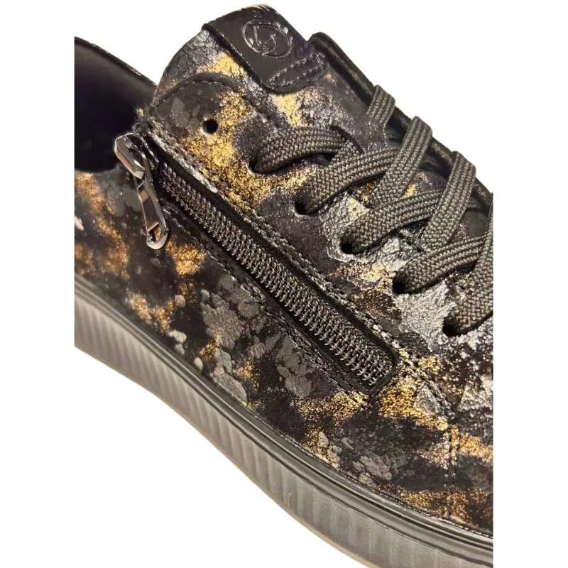 A simple yet classic ladies fashion trainer from Remonte for her. Designed in a combination of leather and synthetic black, with a touch of gold and an elegant scattered pattern. Fastened with side zip and lace closure. Finished with soft textile lining and a padded removable insole.