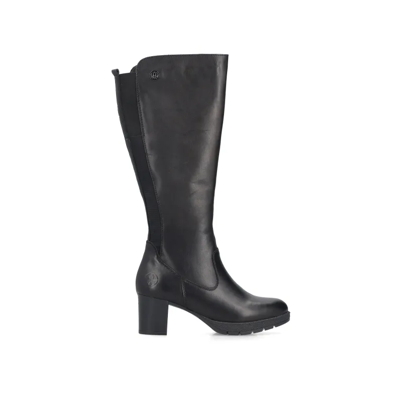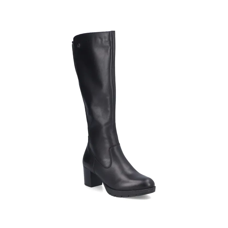 The Rieker 77684 knee-high boot offers sleek sophistication with reliable comfort. Crafted in smooth black leather, it features a side zip for easy on and off and a softly cushioned interior for added comfort. The sturdy block heel provides a stylish lift while maintaining everyday stability, and the flexible Rieker sole ensures lasting wearability. Perfect for pairing with dresses, skirts or slim trousers for an effortlessly polished look.
