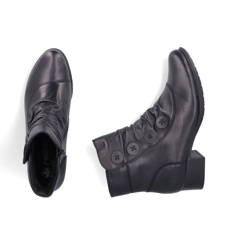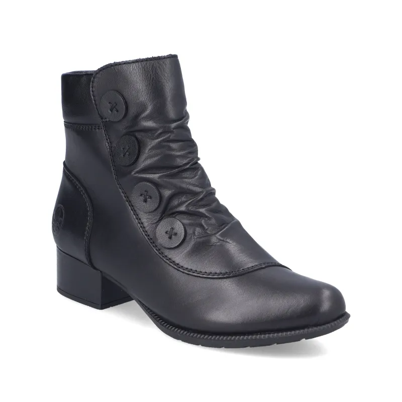 The Rieker womens boot 78659-00 in black is a classic ankle boot designed with both elegance and everyday comfort in mind. Featuring soft leather with subtle ruched detailing and decorative side buttons, it adds timeless charm to any outfit. The low block heel provides just the right amount of lift, while Rieker’s lightweight and flexible sole ensures all-day wearability. Perfect for pairing with jeans, trousers or dresses, these boots are a versatile wardrobe staple.