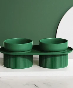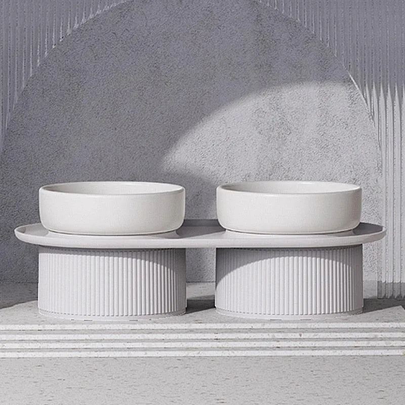Friends don’t let friends eat off the floor. Give your best bud raised food and water bowls. Did you know that an elevated pet food dish is not only said to help prevent spinal issues but may also help your pet digest better? As an added bonus, our Roman Classic Pet Double Feeding Bowls also add instant style to your décor. It’s a win-win any way you look at it. Our elevated food and water bowls are crafted of high-quality ceramic and feature a smooth coating to prevent bacterial growth. They’re the perfect set to keep your pet fed and watered. The ceramic stand has a ridged design which adds to its elegance. Choose White, Green or Pink. These chic ceramic feeding bowls make it easier for your beloved friend to eat and drink comfortably. The base is removable for easy cleaning and each bowl fits into a ridged outline to prevent it from moving.