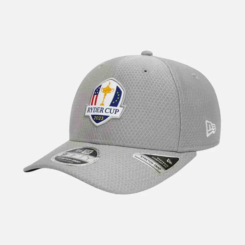 Ryder Cup 2023 Golf Cap in grey, New Era, stretch-snap adjustable comfort snapback fit. Curved visor hat featuring Ryder Cup embroidery and waffle fabric material. One size hat, Official Ryder Cup 2023 collection, licensed merchandise.