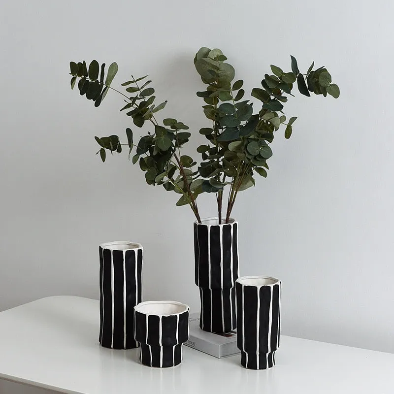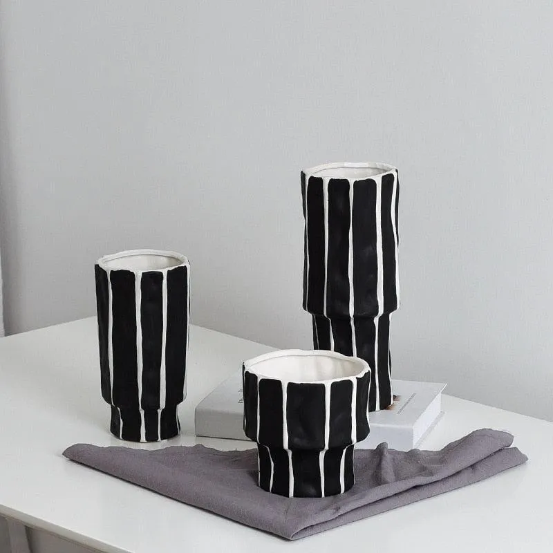 The striking black and white striped design adds a contemporary flair, making it a standout piece among your desktop interior decorations. Its geometric shape not only showcases Nordic aesthetics but also offers a versatile canvas for your creativity. Fill it with vibrant flowers or let it shine on its own as an elegant figurine.