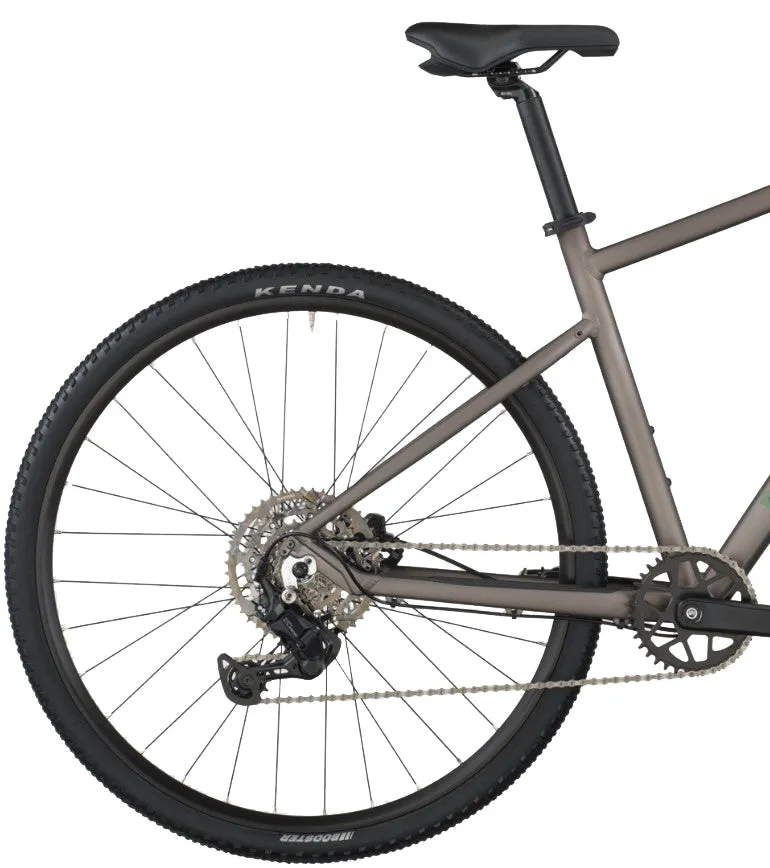 It’s light and nimble in traffic, and planted in the rougher sections on the route with a 63mm suspension fork and wide all-condition Kenda Booster Tires. Shimano’s 9-speed drivetrain gives range to explore and hydraulic brakes give the confidence to handle the unexpected on the ride.