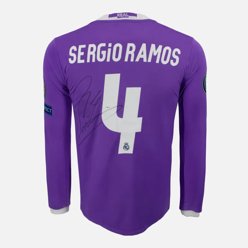 Sergio Ramos personally signed Real Madrid football shirt, iconic purple away shirt from the 2016–17 season. As worn in the 2017 Champions League Final triumph against Juventus, this kit represents a high point in Ramos’s glittering career. The Madrid captain lifted his fourth Champions League title that season and left his mark as one of the club’s greatest ever players, scoring over 100 goals from defence and making more than 650 appearances.