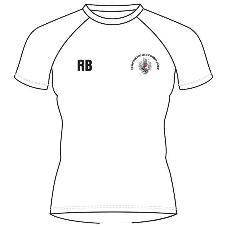 Borlase dance cotton t-shirt with embroidered school crest left breast and initials print on the right breast in black. ‘DANCE’ printed across the back of the shoulders also in black.