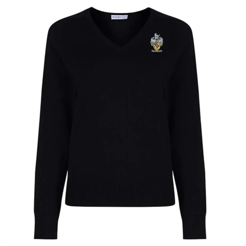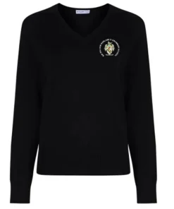 Black girls fit v-neck sweater including school crest. Fine guage knit, soft and durable low pill yarn. Maybe cool tumble-dried.