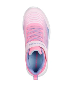 A sporty girls trainer from Skechers, the Microspec Advance has textiles uppers in a mix of pink, blue and lavender coated in a synthetic overlay for increased durability. Complete with lime green trim and fastened by a single velcro strap with bungee laces. Lined in mesh textile with a cushioned footbed.