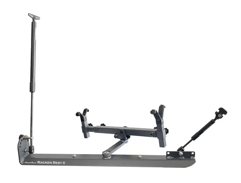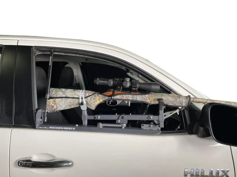 The Racken Rest II is an Australian designed gun rest designed to hold a rifle on a vehicle window sill while driving the vehicle. It can mount to either sides of a vehicle door. The rest is capable of holding a rifle in place to keep the rifle firmly fixed in place. This means a shooter will not be required to repeatedly set up or remove a rifle every time he/she needs to take a shot. The mount has a swivelling capability for lateral and vertical movement. The tension controlled vertical and horizontal swivelling action has a range which is unmatched by any other rest ever developed for the doors of a vehicle. The arms are also telescopically adjustable for height and length to adjust for each rifle and shooter.
