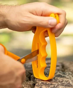Smith’s 10-Second Knife & Scissors Sharpener features a “V” shaped knife sharpening slot with two crossed carbide blades. The carbide blades allow you to put a quick edge on your knife with just three or four strokes and are preset at a fixed sharpening angle for