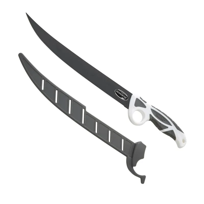 Smith’s Sea Hunter 12″ fillet knife has a non-slip TPE soft grip ergonomic handle with retention ring. The retention ring provides that extra grip needed to fillet that large catch. The handle can be used with or without the retention ring. The 12″ comes with a breathable protective sheath. Features a razor-sharp corrosion-resistant coated 3Cr13 stainless steel blade.