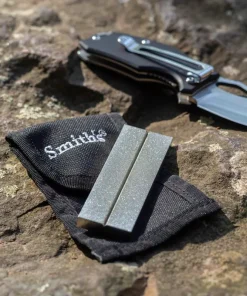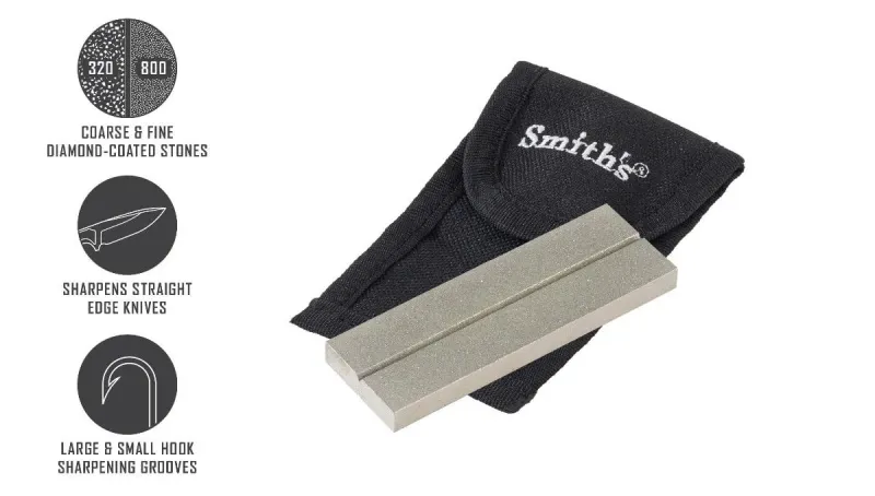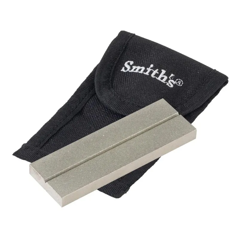 Smith’s 3″ dual grit diamond stone is perfect for sharpening any knife, large or small. It comes with a fabric storage pouch, which features a fold-over flap and belt loop. The stone features a V-shaped groove great for sharpening fish hooks. These extremely fast honing 320 and 800 grit diamond stones will quickly sharpen anything with a cutting edge including high carbon and stainless steel knives.