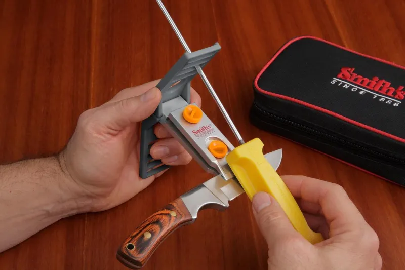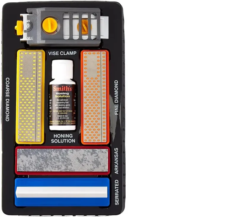 Smith’s Diamond/Arkansas Stones Precision Knife Sharpening System offers an easy way to sharpen all types of knives . . . INCLUDING SERRATED. The fabric storage pouch makes this kit portable and easy to store, and the 1-inch wide stones makes sharpening safe, fast, and easy. The kit comes with a Coarse Diamond Stone, Fine Diamond Stone, Fine Arkansas Stone, Medium Triangular shaped Ceramic Stone for serrated edges only, and Premium Honing Solution.